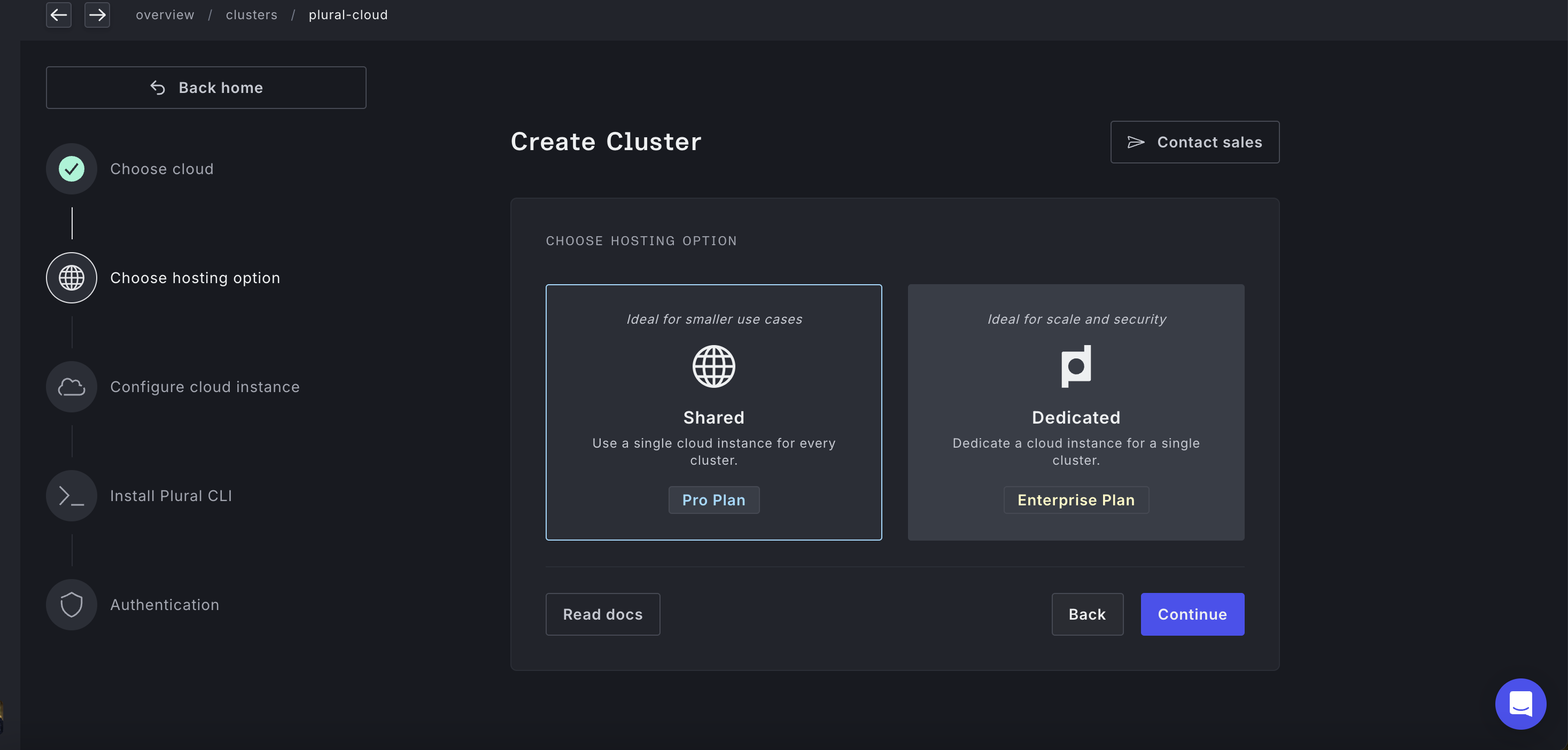 The Cloud setup flow is relatively straightforward, go to https://app.plural.sh/create-cluster and fill out a wizard that looks like: