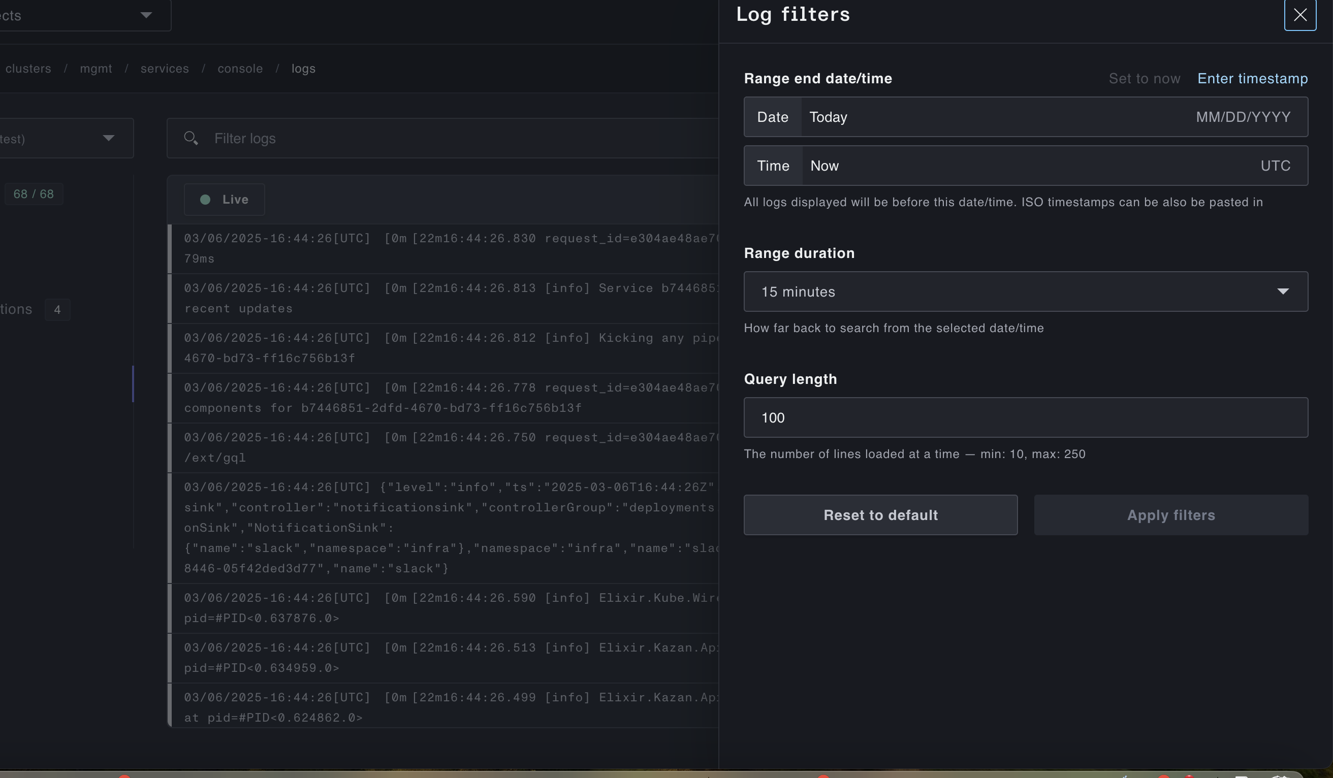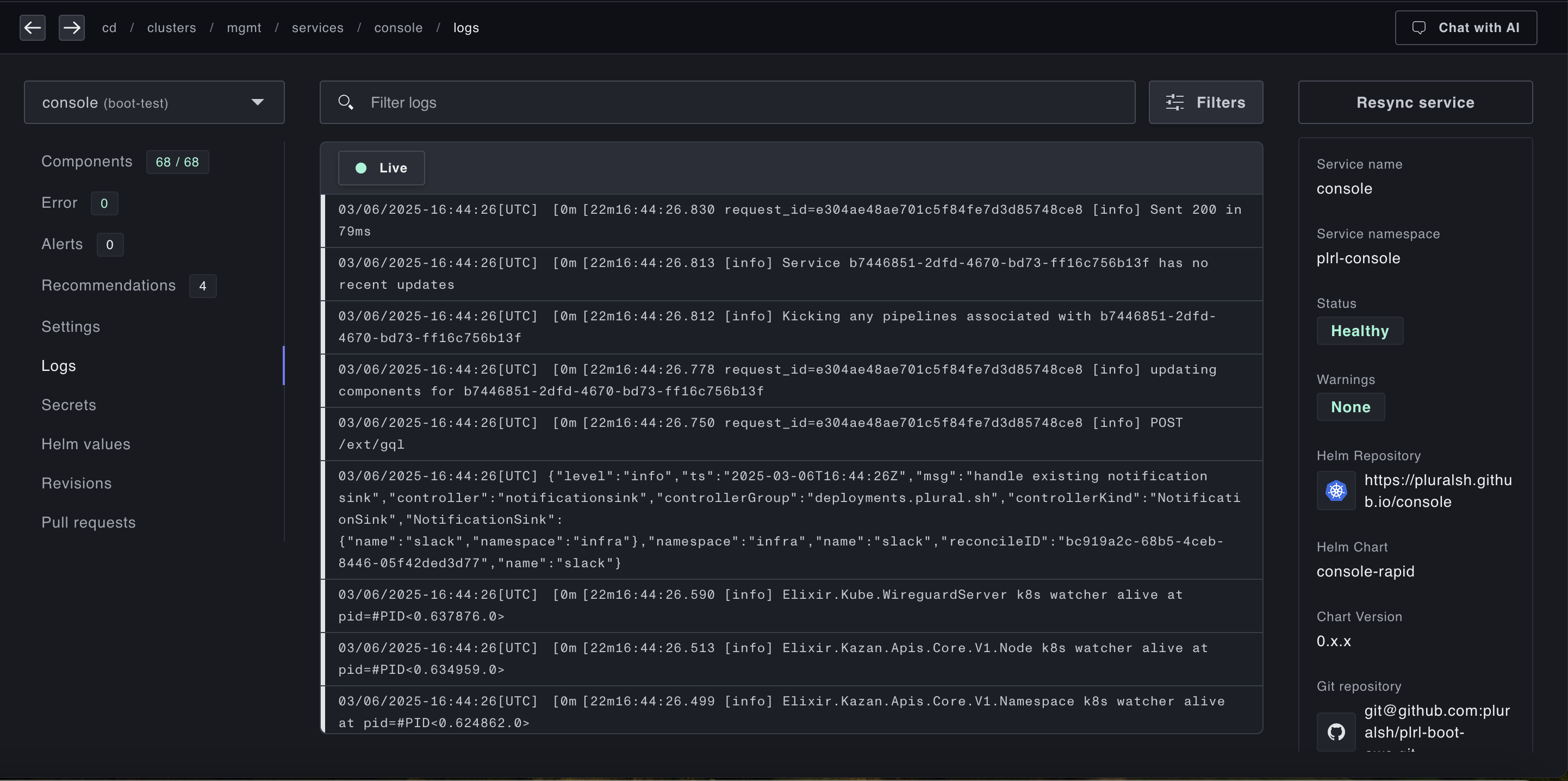 Plural's built-in log support allows you to query logs at either the Plural Service or Cluster level, dependent on your permissions to those respective resources. Service logs are relevant for developer personas, whereas cluster logs are usually useful for platform engineers or kubernetes admins.